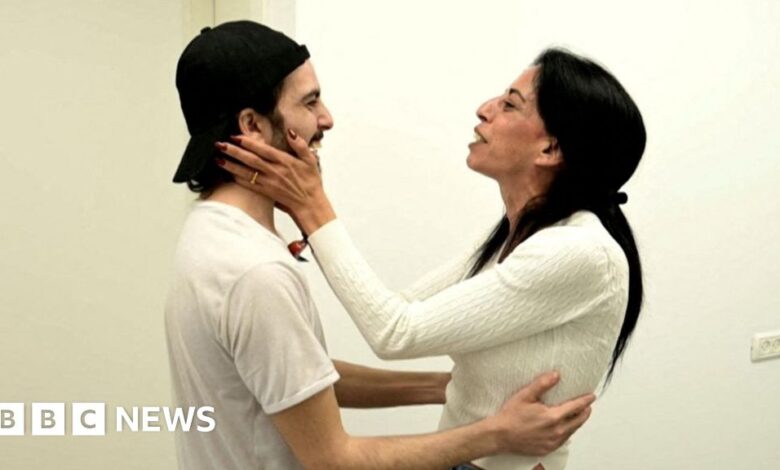 Matan Zangauker, 25, walks grinning into his mother’s arms.