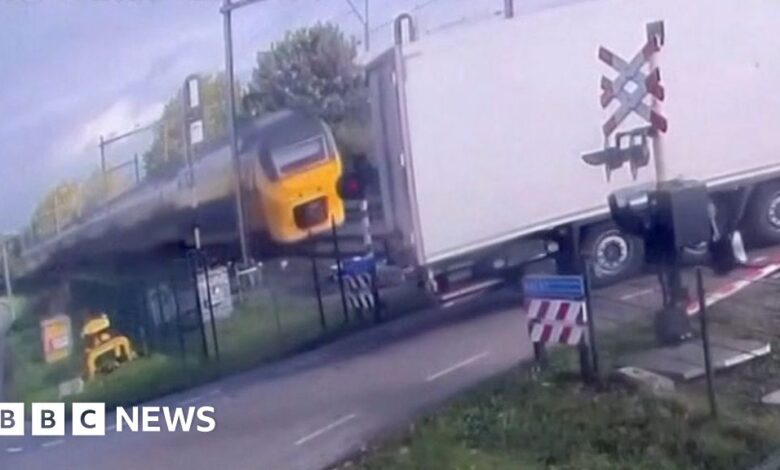 CCTV footage shows the dramatic moment a train crashed into a truck at a level crossing in the Netherlands.