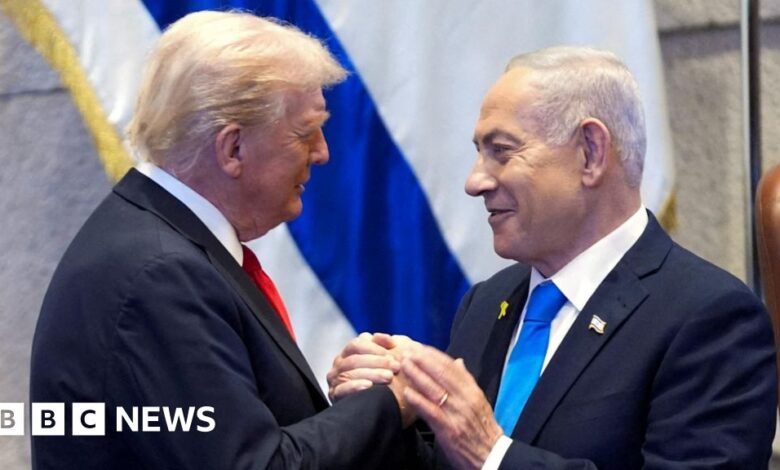 Reuters US President Donald Trump (L) shakes hands with Israeli Prime Minister Benjamin Netanyahu (R) during an address to the Israeli parliament in Jerusalem (13 October 2025)Reuters