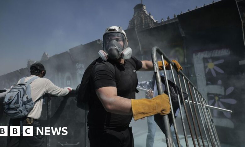 Demonstrators dismantled parts of a barrier protecting the National Palace, where Sheinbaum lives. Police protecting the compound used tear gas on the crowds.
