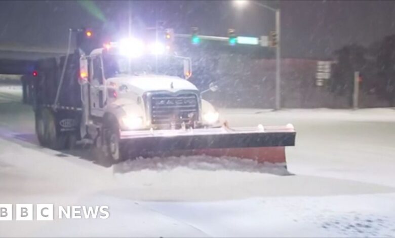 Snow ploughs battle blizzards on roads and runways in Oklahoma